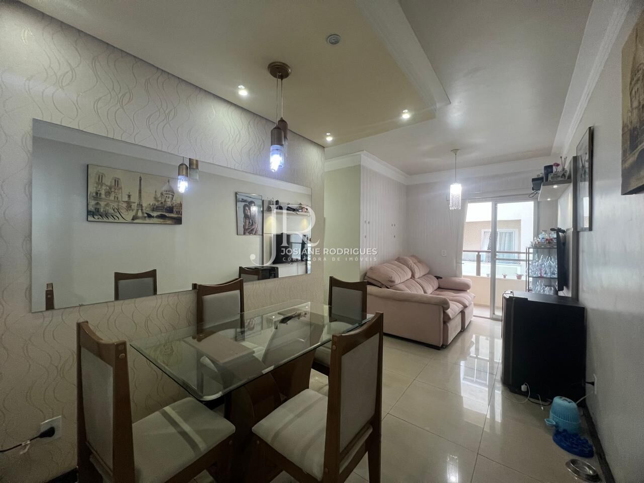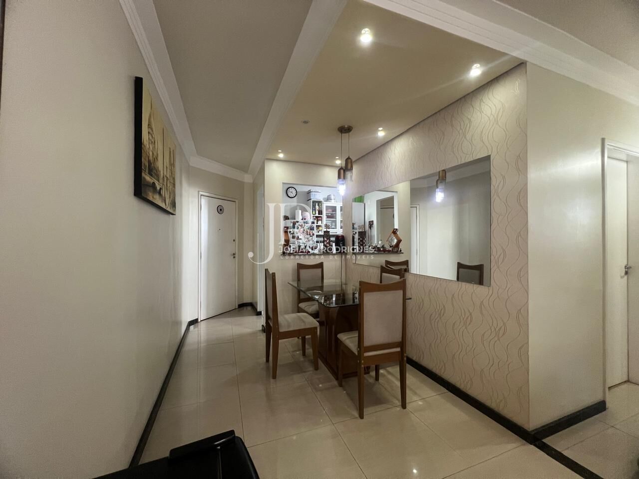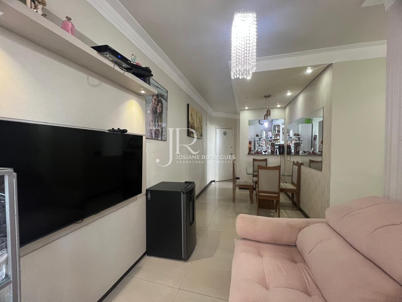 São 64m² com 03 dormitórios sendo 01 suíte, suíte com ventilador de teto, banheiro social e suíte com box de vidro e gabinete espelho, 01 dormitório configurado como closet, sala de jantar com gesso rebaixado e spots de iluminação sala de TV com painel, e varanda integrada, cozinha com armários, área de serviço e garagem coberta.